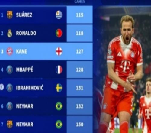 本世纪为单一球队参与150球最快纪录榜:苏亚雷斯居首,凯恩第三